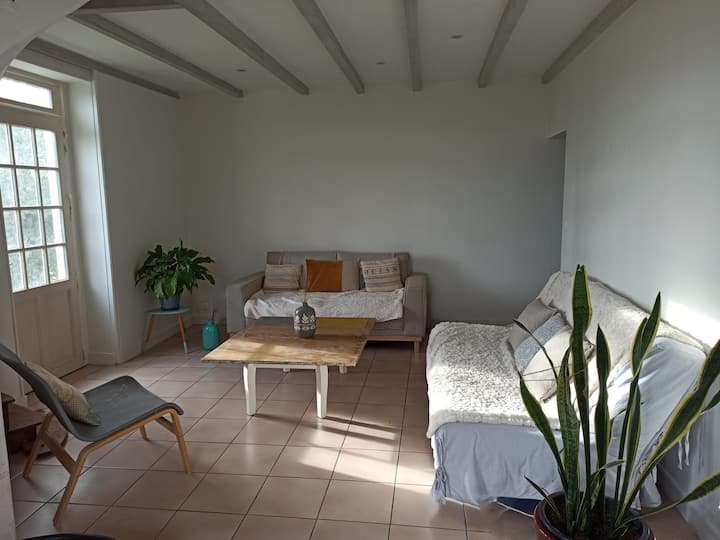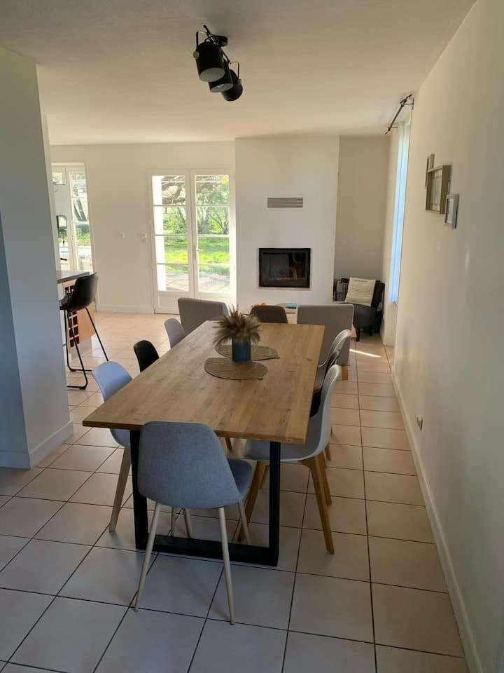 Disfrute de una hermosa cocina equipada (nevera, congelador, horno, placas de inducción, lavavajillas, microondas, cafetera, hervidor de agua, tostadora) abierta a un comedor agradable (mesa para 8 personas) y una amplia sala de estar con dos sofás. La casa tiene un gran cuarto de baño con ducha a ras de suelo, bañera y lavabo doble, así como un inodoro separado.