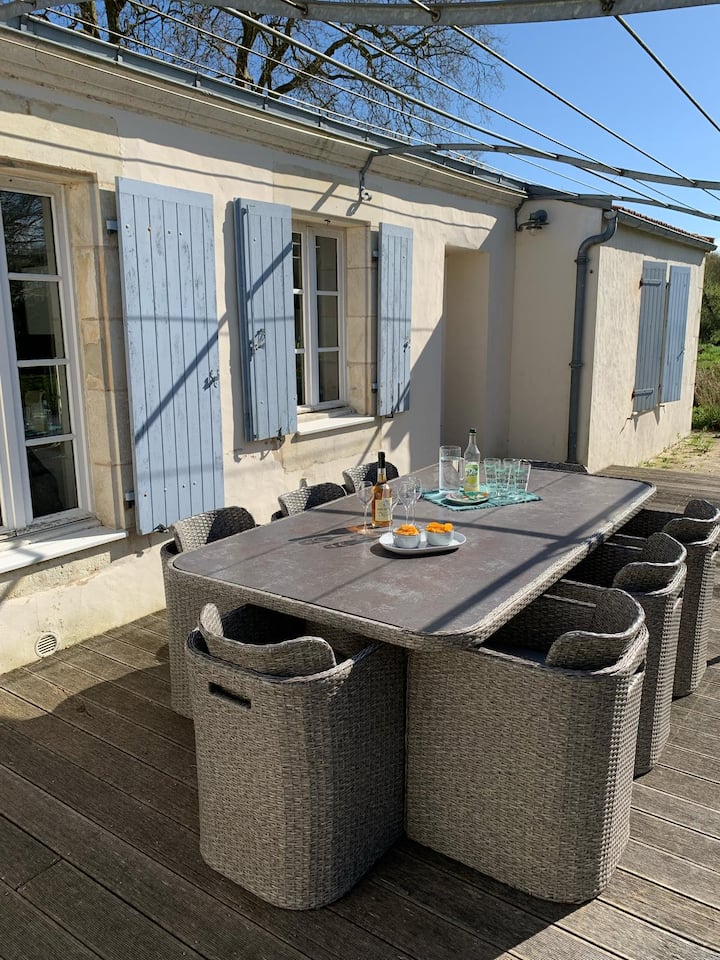 En el exterior, disfrute de una gran terraza con muebles para 8 personas en un bonito terreno arbolado.