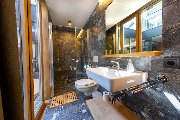 Relájate con una ducha con efecto de lluvia y una sauna.