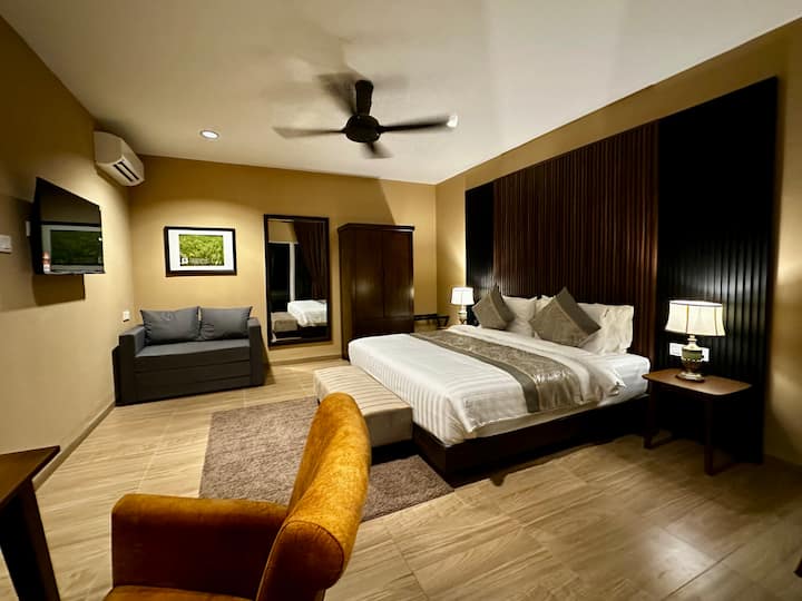 Una escalera en el salón conduce al dormitorio principal en la planta superior, que cuenta con balcones con vistas aéreas de la piscina, los arrozales y las montañas. En la parte trasera del salón, una puerta de cristal se abre a la piscina y al jardín, junto con pasillos que conducen a otros tres dormitorios en la planta baja. Todas las habitaciones son de tamaño similar, tienen aire acondicionado y cuentan con baño privado con accesorios de lujo. Cada habitación incluye una cama tamaño king, dos mesitas de noche, un sofá cama individual, un televisor Google con acceso a Netflix, un escritorio y un armario, que también tiene una plancha y una mini tabla de planchar.