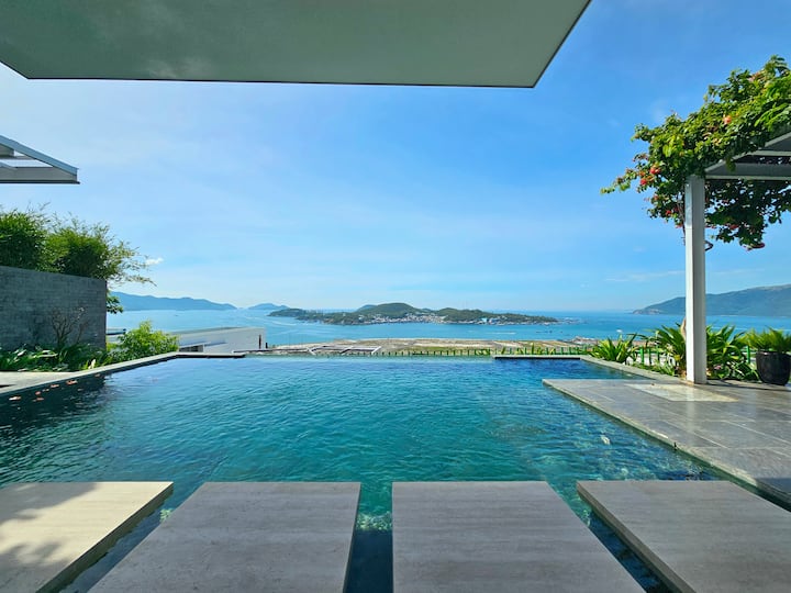 La villa está en las colinas y con vistas al mar, abrazando la bahía de Nha Trang.
