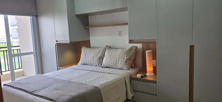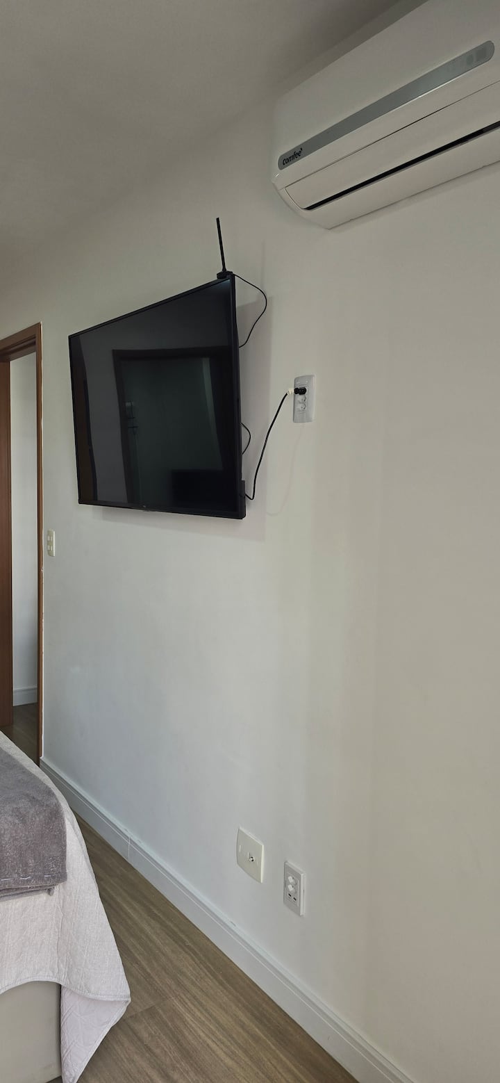 Consta de una cocina completa, muchos utensilios, sala de estar con sofá retráctil nuevo, TV inteligente de 50 pulgadas, suite de dormitorio y gran balcón con lavandería.