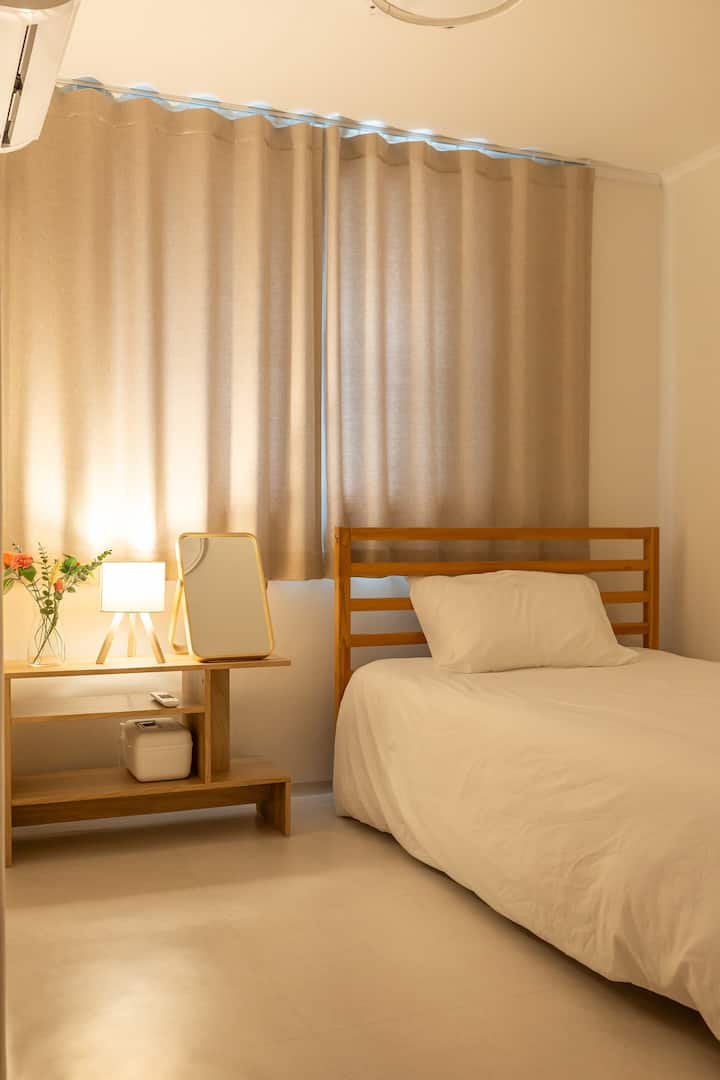 Incluso si te quedas durante mucho tiempo, puedes quedarte cómodamente como en tu propia casa con varios utensilios de cocina, condimentos, refrigerador, microondas, inducción, tostadora, cafetera, secadora, plancha, lavadora de gran capacidad, secadora, etc., y varios aperitivos de bienvenida, toallas, champú, acondicionador, gel de baño, desinfectante de manos, etc.