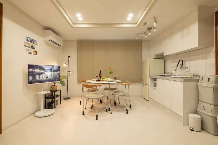 El tamaño del apartamento es de más de 25 pyeong, y puedes usarlo de manera espaciosa y cómoda como un dormitorio espacioso y cómodo para amigos y viajes familiares, y si hay un pequeño número de personas, puedes usarlo como un espacio privado en cada habitación. Hay mesas y sillas disponibles para 5 personas o más.