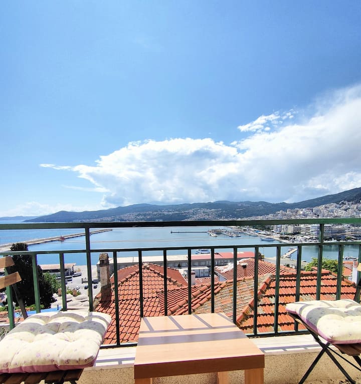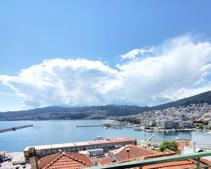 Una de las características más destacadas del piso es la vista: sal al balcón o mira por las ventanas para ver un amplio panorama de los tejados de Kavala, el puerto y el mar a lo lejos. Es el lugar perfecto para tomar tu café por la mañana o una copa de vino por la noche.