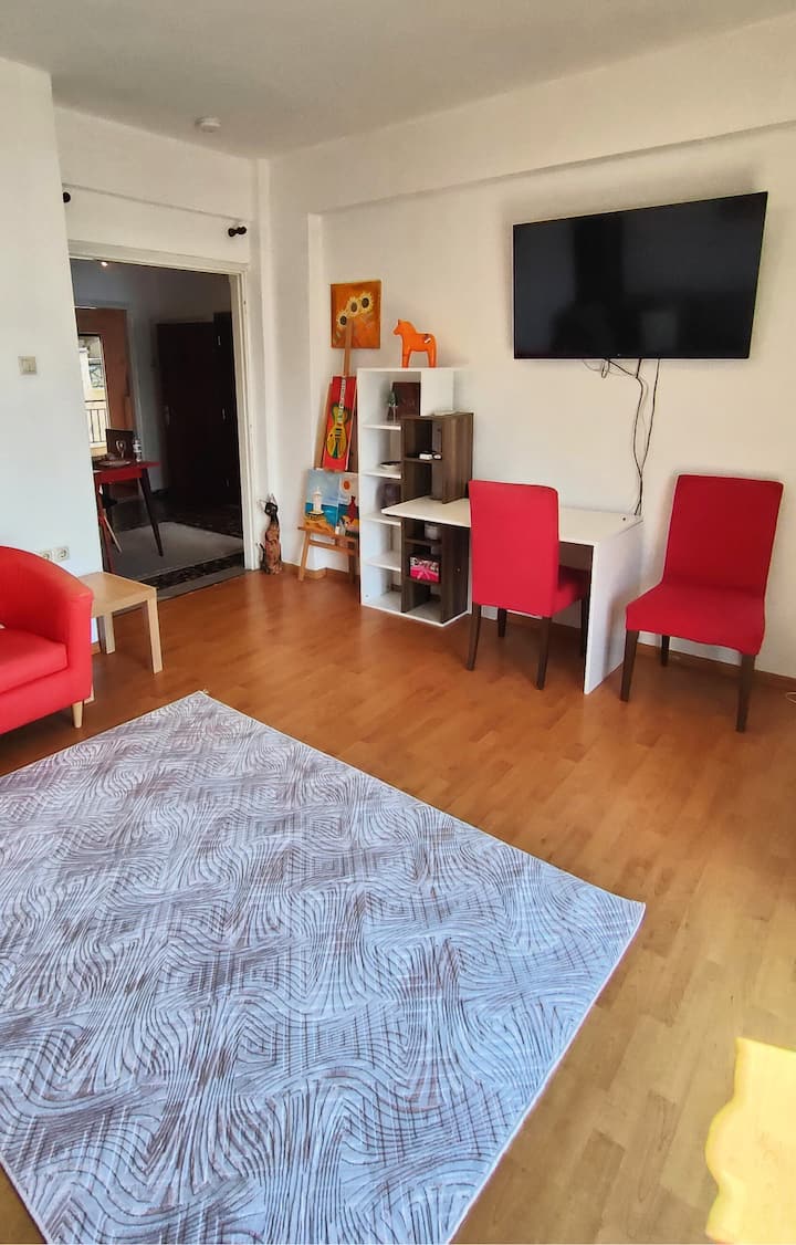 Sala de estar: una acogedora sala de estar con sofá y TV de pantalla plana, donde puedes relajarte después de un día explorando la ciudad.