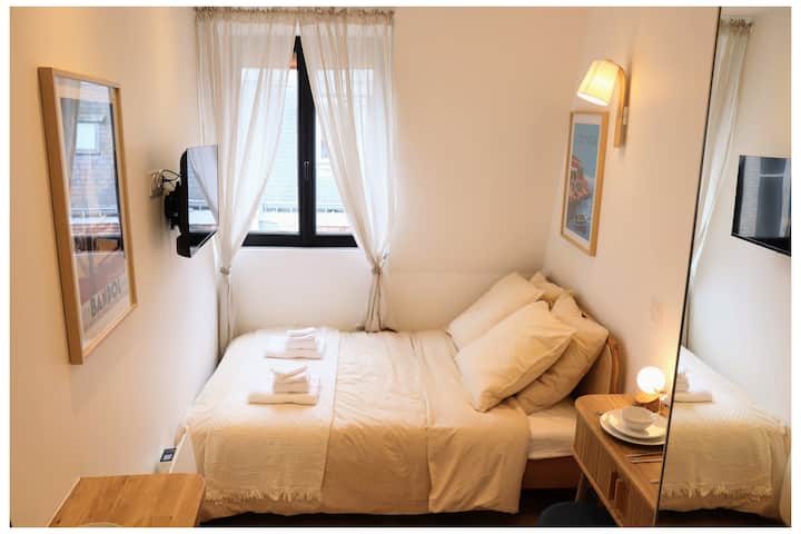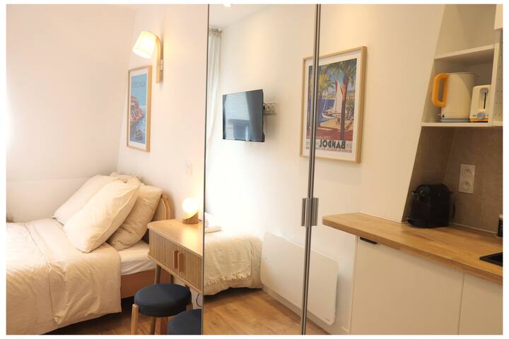 Antigua habitación de criada convertida en capullo refinado, el estudio de 12 m² ha sido pensado como una mini suite de hotel, cálida y ultra funcional. Es perfecto para un(a) profesional en misión en París, un estudiante de estancia prolongada o una pareja que desee descubrir la ciudad a su propio ritmo.