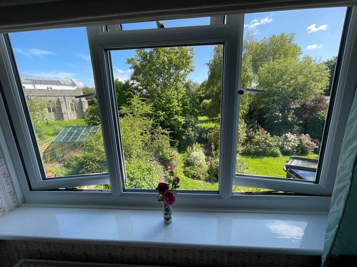 Dormitorio doble con vistas al jardín y desayuno