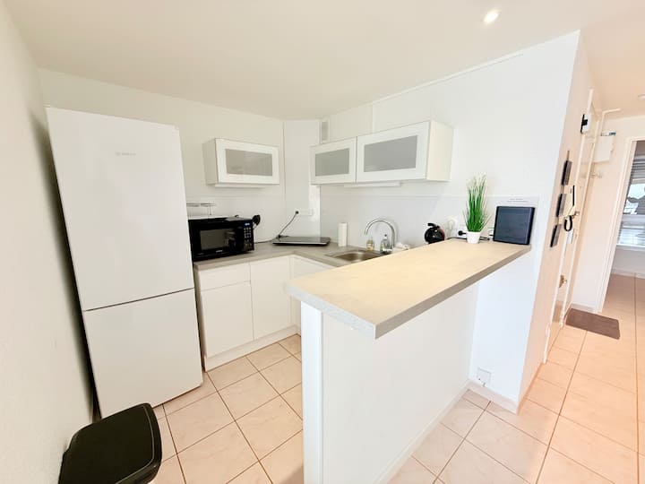 COCINA abierta a la sala de estar con barra/encimera, y equipada con placas de cocción eléctricas portátiles (2 fuegos), lavavajillas, horno microondas, nevera grande con compartimento congelador, cafetera DOLCE GUSTO, hervidor de agua, tostadora, y todo lo necesario para hacer buenos platos.