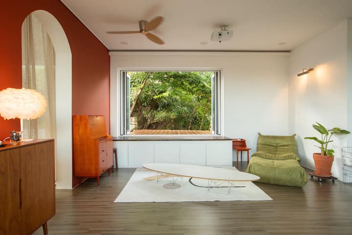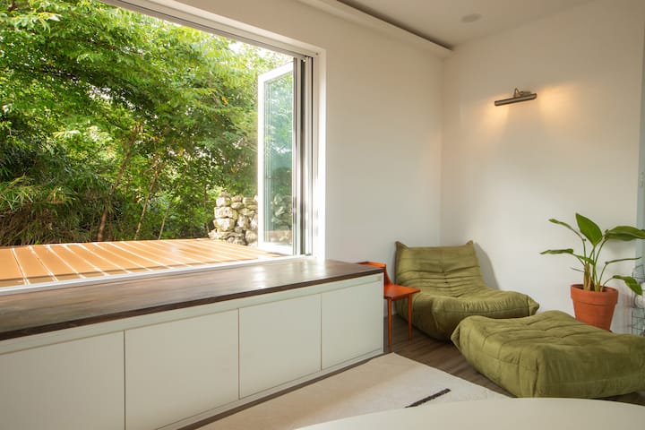 - Hay un escritorio, un soporte de escritorio, aire acondicionado y un ventilador, por lo que es un espacio adecuado para leer o descansar.