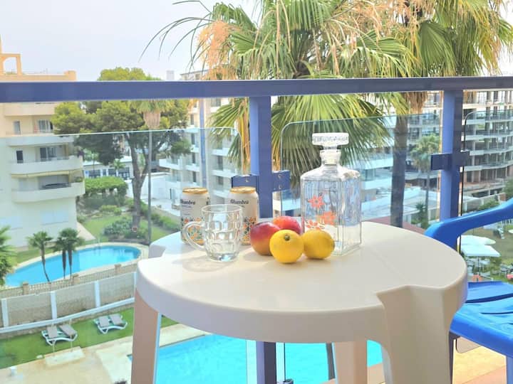 Estudio Pepitas con vistas al mar y a la piscina