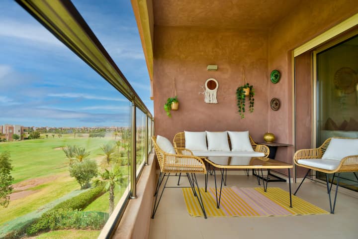 Apartamento de 2 dormitorios con vistas al campo de golf, piscina, aire acondicionado y aparcamiento a 3 minutos del aeropuerto