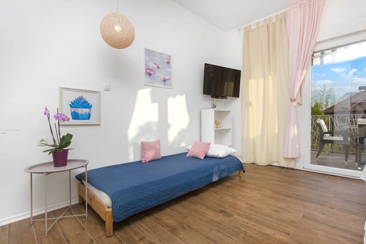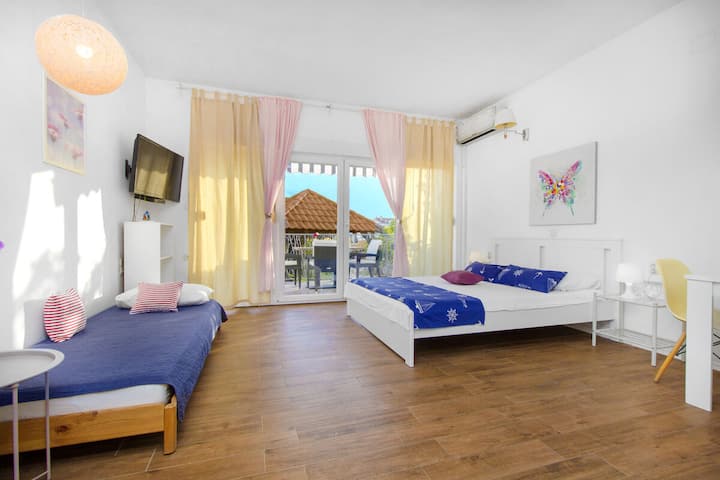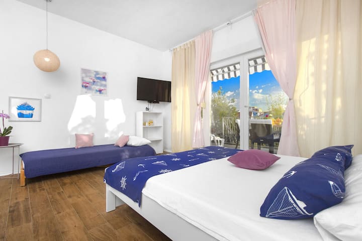 Estudio n.º 3, cerca de la playa, terraza, comidas en el sitio