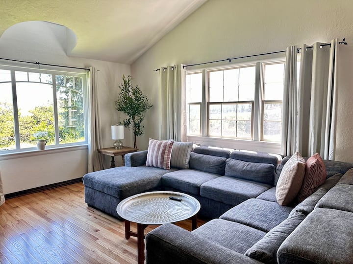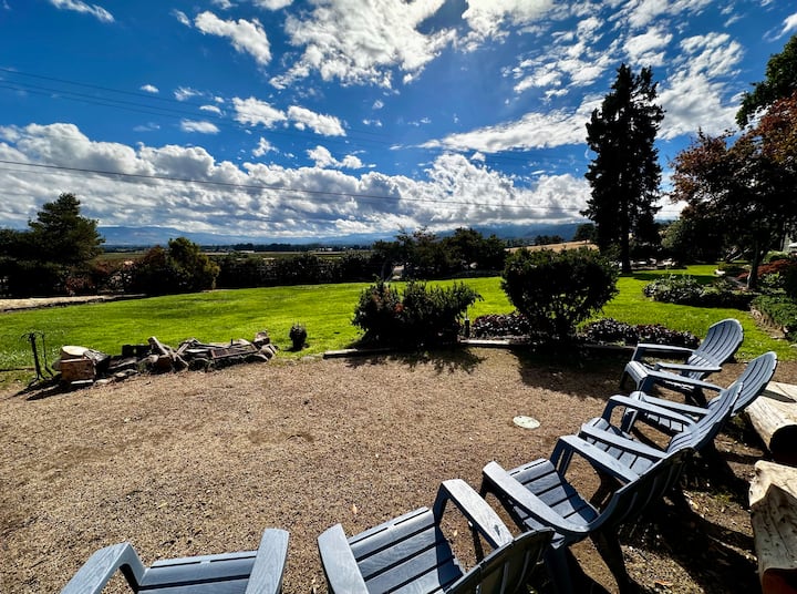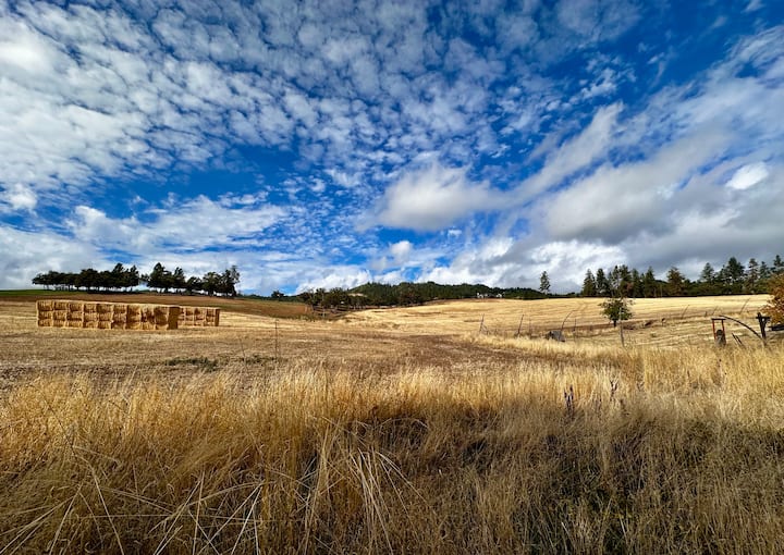 ¡Despiértate con impresionantes amaneceres sobre las ondulantes colinas! La sala de estar delantera y la chimenea ofrecen el lugar perfecto para el café de la mañana o la observación de las estrellas por la noche. A medida que el día se acaba, reúnete bajo la pérgola cubierta de glicinas con barbacoas, un bar de vinos y unas impresionantes vistas al atardecer sobre las colinas y las fincas vecinas. La propiedad está cerrada para mayor privacidad, rodeada de árboles frutales, jardines y encanto rústico, ¡pero a minutos de la histórica Jacksonville, Medford y el vino!