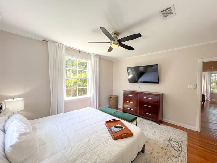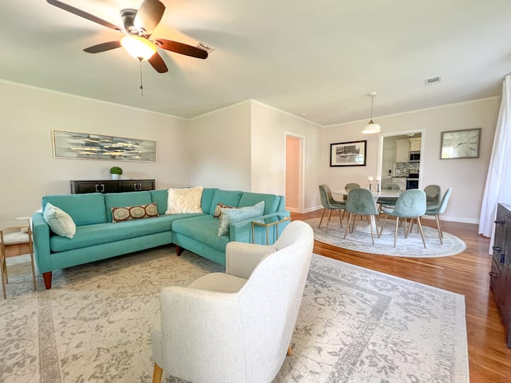 Hay mucho espacio en la sala de estar para relajarse y ver películas en la Roku SmartTV. El estudio tiene un escritorio y una silla para colocar tu portátil. Hay wifi de alta velocidad disponible. El porche trasero está protegido y es un excelente espacio para disfrutar del aire libre. El patio, compartido con la casa de huéspedes, es un gran lugar para pasar el rato.