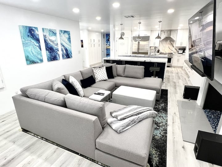 La sala de estar tiene un Sony de85pulgadas con una barra de sonido y una acogedora chimenea. Hay 4 dormitorios, cada habitación con un televisor inteligente Sony de 65 pulgadas con portaequipajes y planchas, tres de las habitaciones tienen camas tamaño king con sábanas de calidad y un área de escritorio y el cuarto dormitorio tiene dos literas que son camas de tamaño completo. Hay tres baños que ofrecen todo lo necesario para que te olvides de empacar cualquier cosa de