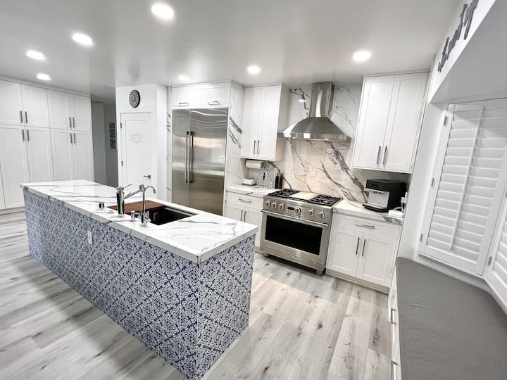 Una planta abierta que tiene una isla doble. El refrigerador tiene una jarra de recarga automática de agua fría de ósmosis inversa cada vez que vuelves a colocar la jarra en la nevera. Toda la casa tiene un calentador de agua sin tanque con un sistema de filtración y ablandamiento de agua de calidad extraordinaria. Agua de ósmosis inversa de primera calidad, agua caliente instantánea y agua potable alcalina a temperatura ambiente para que no tengas que comprar agua embotellada ni agua alcalina. Ducharse y lavarse las manos en este sistema de agua mejorará su piel, cabello y lo hidratará con agua potable alcalina.