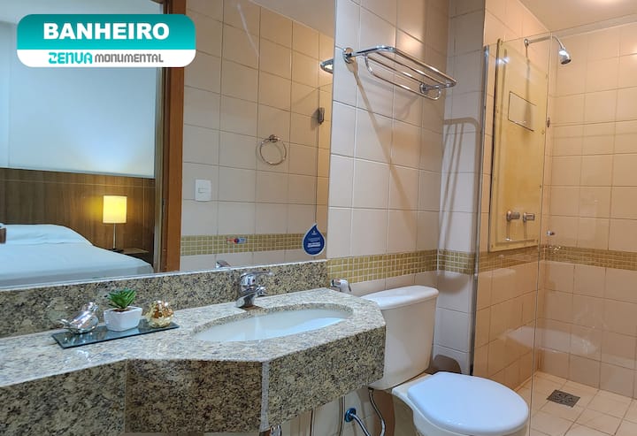 El edificio es moderno y cuenta con una recepción bilingüe que funciona las 24 horas del día. El restaurante ofrece servicio de habitaciones para su comodidad. El edificio cuenta con gimnasio y sauna, además de una piscina en la azotea con la vista más hermosa de Brasilia. Ven a renovar tus energías.