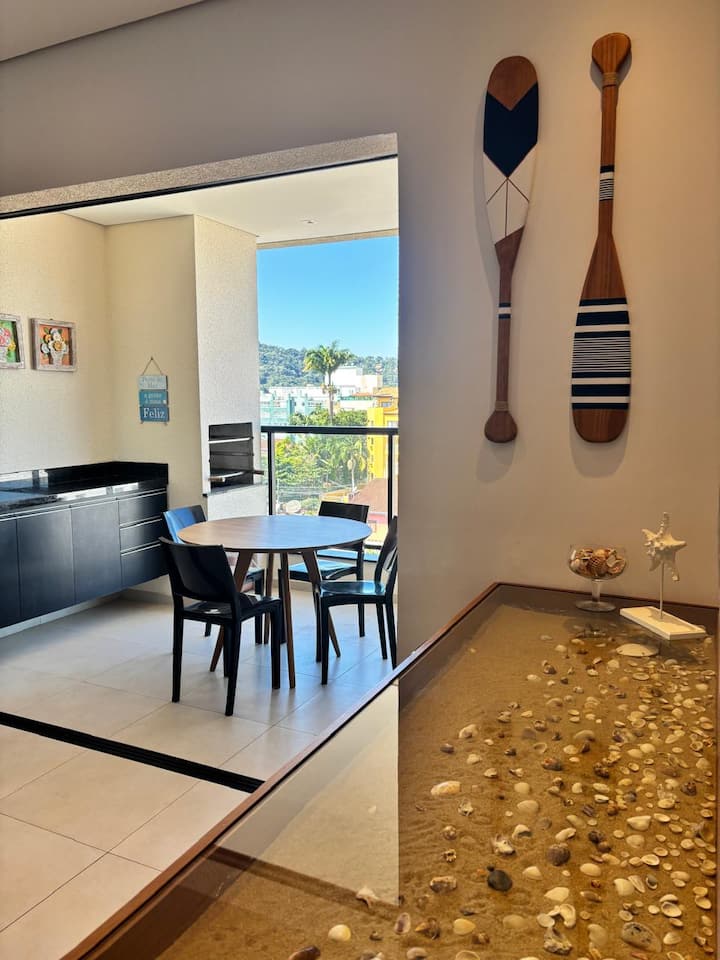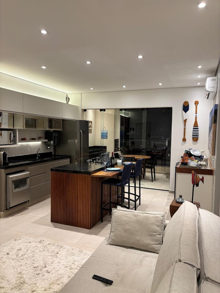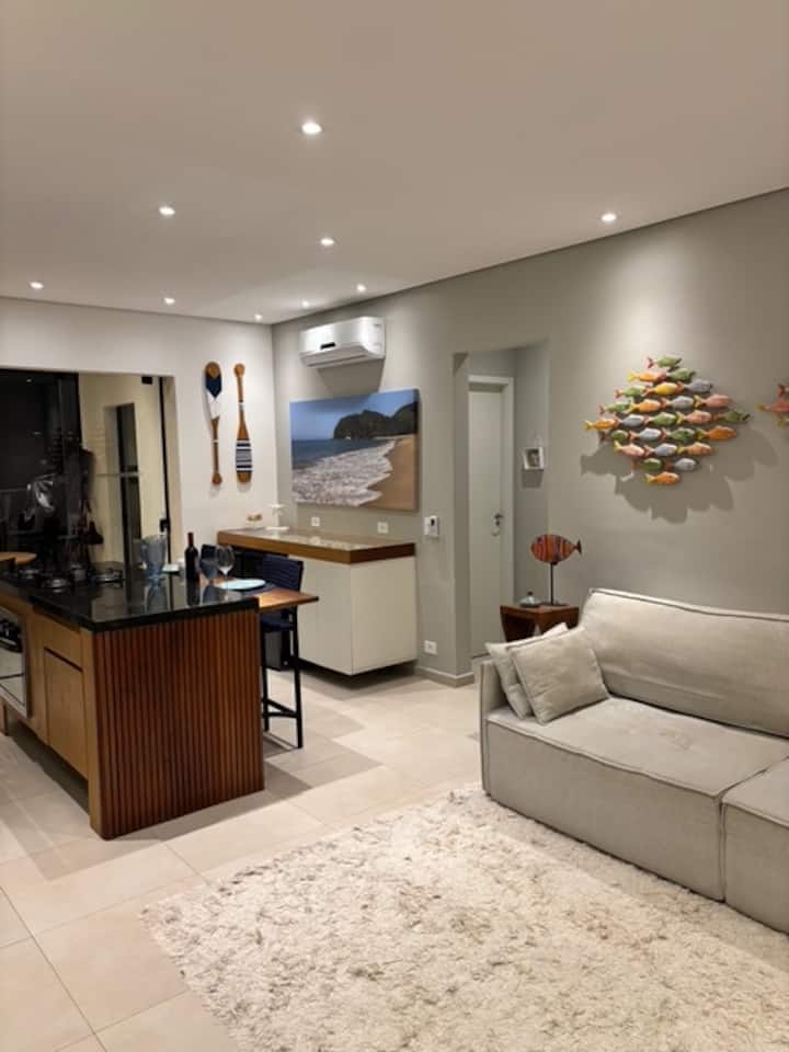 Muy buen gusto en Ubatuba, con aire acondicionado en todos los ambientes, camas de caja, wifi con gran señal, barbacoa en el balcón, cervecería, lavavajillas y lavado de ropa.