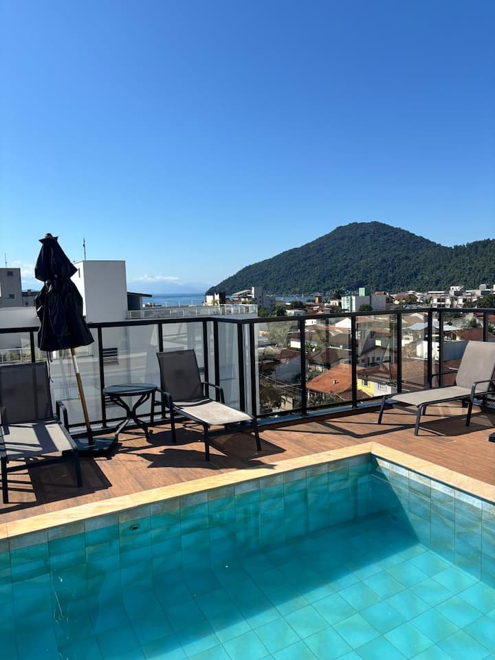 Ubicado en la quinta planta, en el ático del edificio, permite el acceso directo a la piscina y al horno de pizza. Desde el balcón se puede ver la playa de Itaguá, donde salen los barcos para ir a la playa y a las islas paradisíacas.
