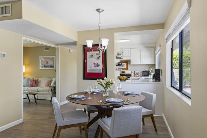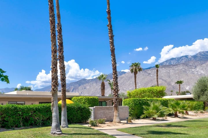 Un refugio luminoso y cómodo en Palm Springs con interiores modernos, un acogedor patio privado y acceso a la piscina comunitaria y al spa para una vida relajada en el desierto.