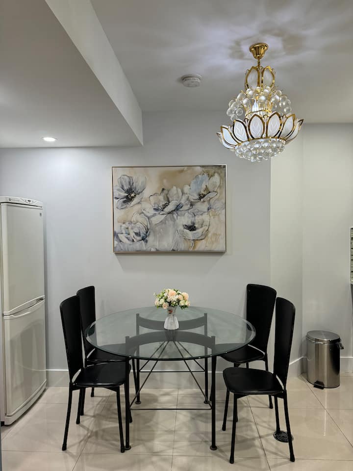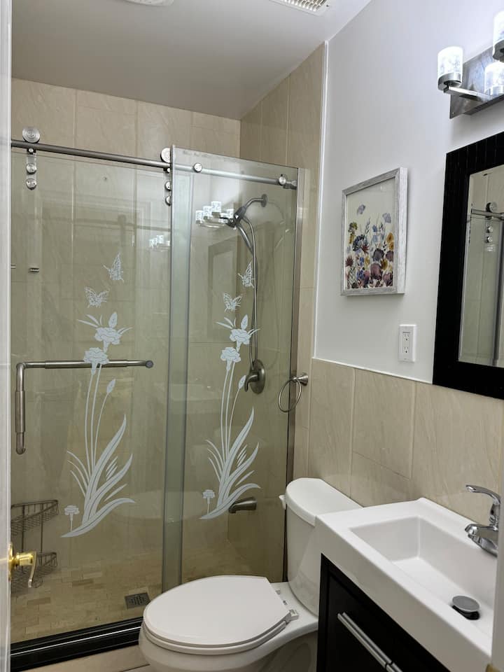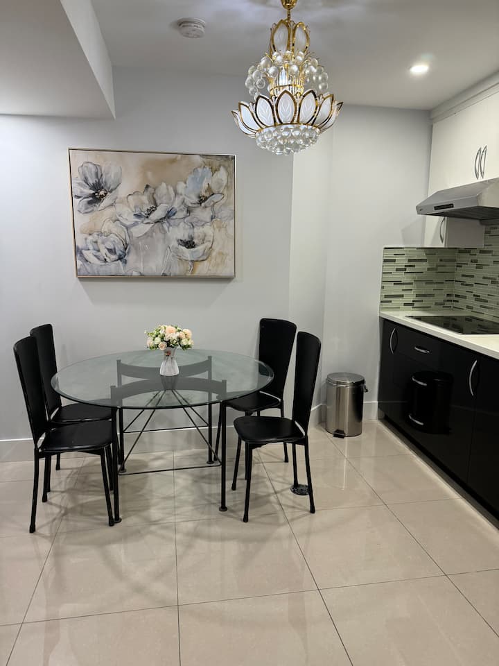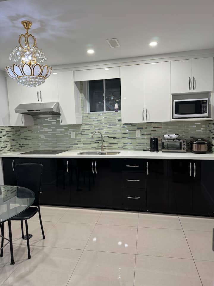 Elegante estudio en sótano con baño privado y cocina.