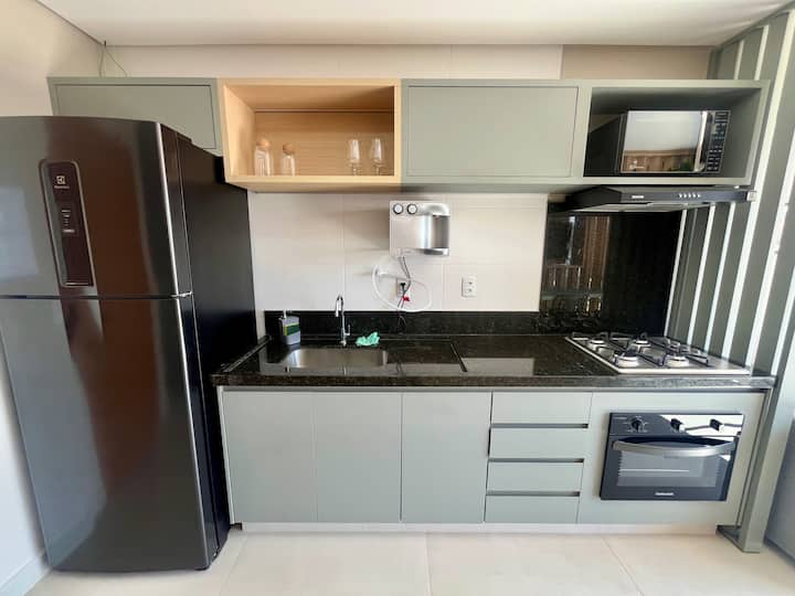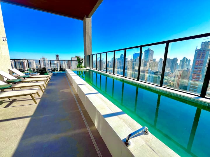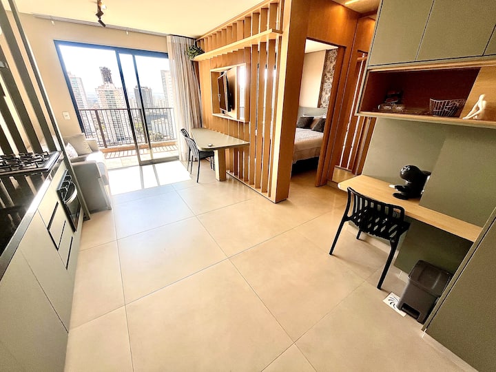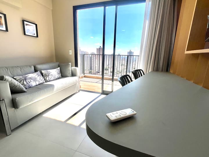 Nuevo condominio ❗️Un apartamento único, elegante y sofisticado, hecho para hacerte sentir en casa. Mira tu película favorita en el dormitorio o en la sala de estar con TV giratoria con canales abiertos y aire acondicionado en la habitación. ¡Descansa en una cama tamaño queen y disfruta de la vista desde el amplio balcón del jardín y de una hermosa puesta de sol en el contemporáneo Setor Bueno en la mejor región de Goiânia!
