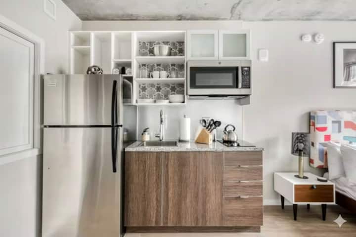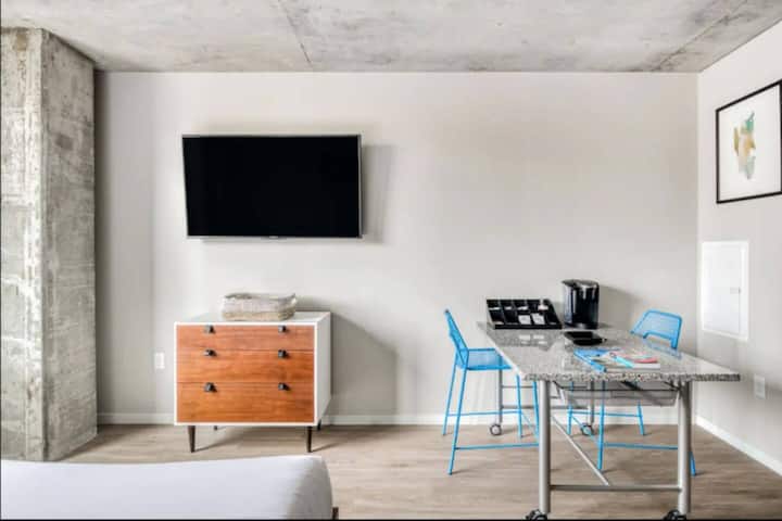 Nuestros amplios apartamentos de dos dormitorios pueden alojar hasta seis huéspedes con una cama tamaño queen y un sofá cama para dos personas. También tendrás dos baños modernos, ambos con cabezales de ducha de efecto lluvia. Te encantará tu impresionante cocina que está decorada con electrodomésticos de acero inoxidable, encimeras de granito, una máquina Keurig y mucho más. Después de un largo día explorando la ciudad, relájate frente a tu televisor de pantalla plana con Roku y wifi ilimitado. Mejor aún, disfruta de las vistas del centro de la ciudad en tu propio balcón privado.
