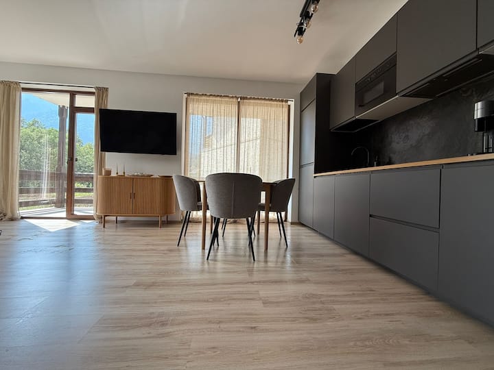 La amplia sala de estar, llena de luz natural, cuenta con un televisor inteligente Full HD con acceso a streaming, un sofá extensible para invitados adicionales, un acogedor rincón de lectura y una gran mesa de comedor para 4 personas. Las puertas de cristal conducen directamente al balcón, donde encontrarás unas vistas impresionantes y aire fresco de montaña.