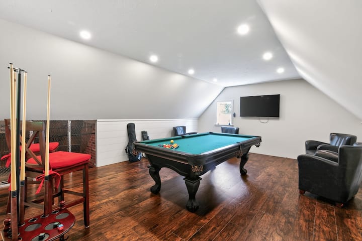 Encima del garaje hay una sala de juegos completa con una mesa de billar y TV, perfecta para la diversión en interiores.