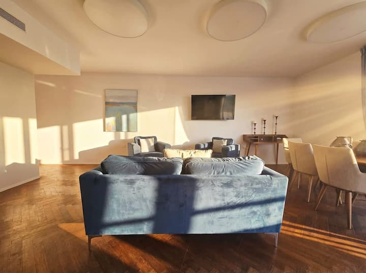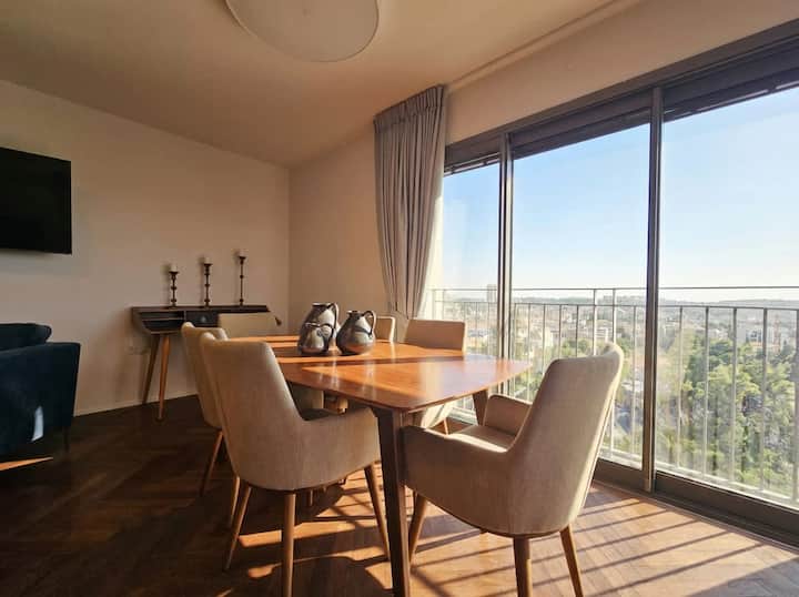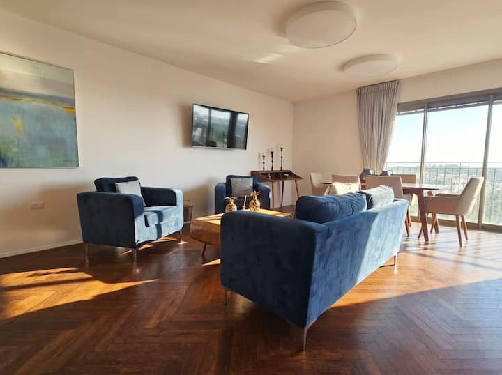 Desde el momento en que entras, te damos la bienvenida a un espacio diseñado para una vida refinada. El amplio salón está bañado de luz natural, con ventanales de suelo a techo que atraen la mirada hacia la vista panorámica. La sala de estar se abre a una terraza privada, por ejemplo, disfrutar de una mañana tranquila con la ciudad a tus pies o de una noche inolvidable con el atardecer dorado de Jerusalén como telón de fondo.