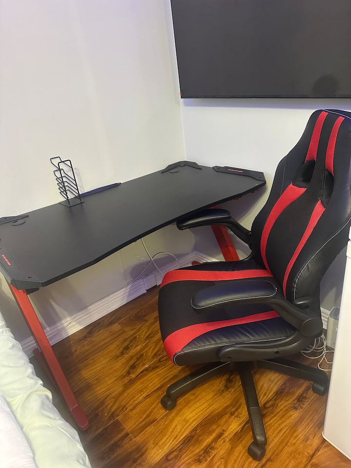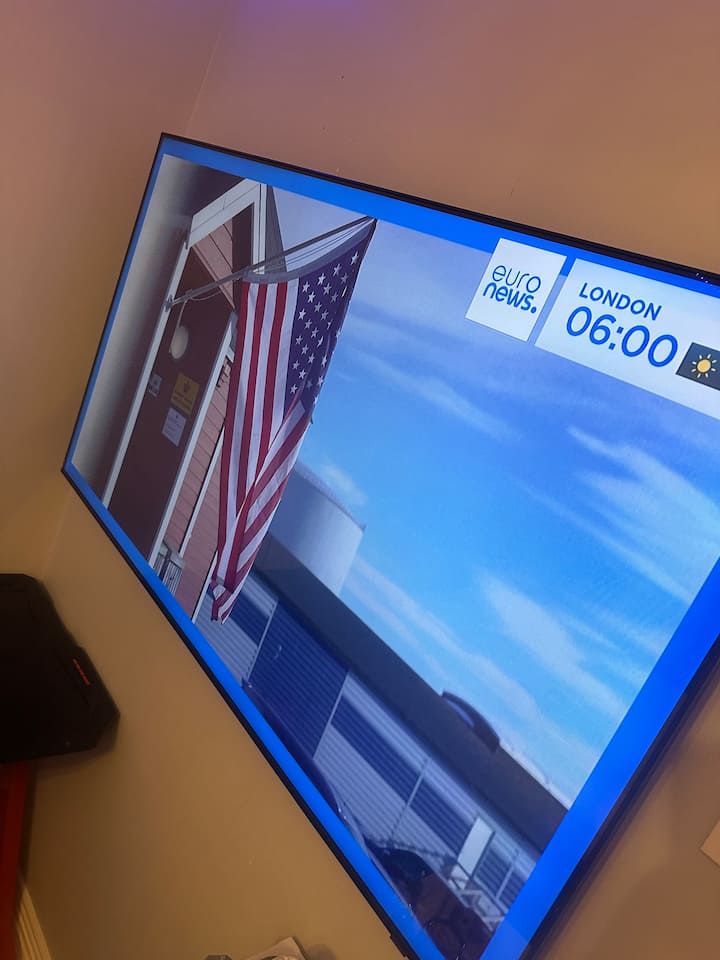 Relájese en un acogedor baño con TV inteligente de 65", espacio de trabajo
