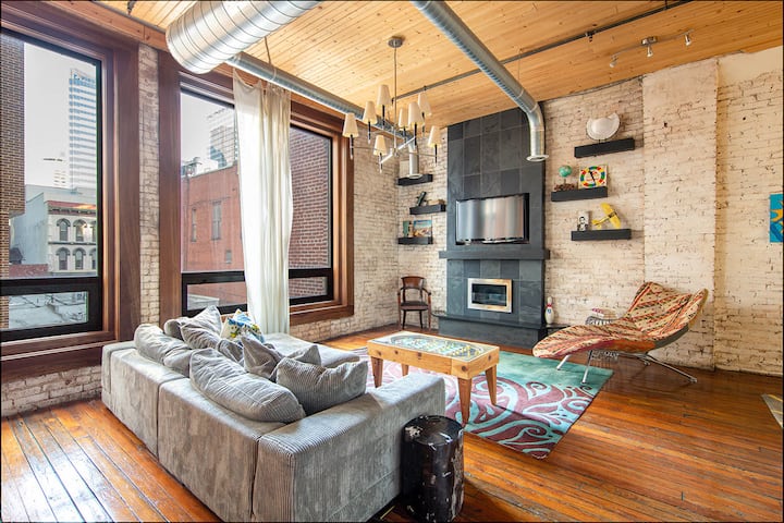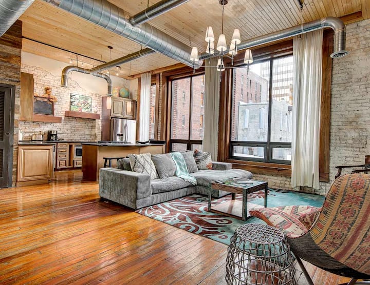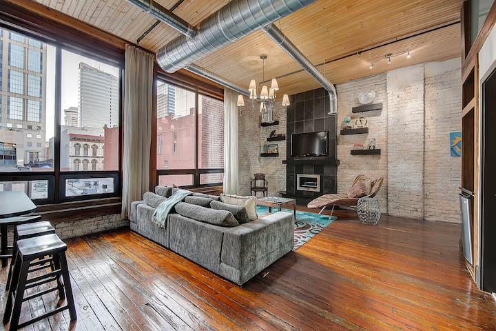 Loft plano: acogedor y elegante de 851 pies cuadrados. 1 dormitorio/1 baño con ventanas de suelo a techo y arte funky. Ubicado en el histórico Printers Alley, en el centro de Nashville, a pocos pasos de Broadway, Bridgestone Arena y mucho más. Cuenta con cocina completa, lujosa cama tamaño king, wifi y asistencia 24/7. Capacidad para 2-4 personas (suplemento de 25 $/noche por huésped a partir de 2). Conserje disponible. Patio en la entrada para que todos los huéspedes se relajen y disfruten. ☆ ALGUNOS EXTRAS: pregunta por otros Printers Alley Lofts para grupos más grandes o si necesitas más espacio.