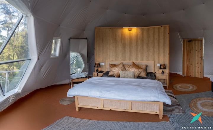 Puedes elegir entre nuestras vibrantes cúpulas para grupos, perfectas para aventuras compartidas en la montaña, o cúpulas privadas íntimas diseñadas para escapadas románticas en el abrazo de la naturaleza. Cada cúpula de dos pisos cuenta con una acogedora sala de estar y un baño en la planta baja, mientras que la planta superior alberga un dormitorio privado con vistas panorámicas al valle. La experiencia trasciende el glamping tradicional con Starship, nuestra galería dedicada a la observación de las estrellas que transforma la observación del cielo nocturno en pura magia. La moderna cafetería interior ofrece deliciosas comidas reconfortantes, mientras que la estación de bebidas al aire libre es perfecta para relajarse y disfrutar de unas impresionantes vistas a las montañas. Cuando cae el cielo nocturno, la zona de la hoguera se convierte en el corazón de las fiestas, donde puedes reunirte con tus seres queridos para compartir historias mientras hacéis una barbacoa. Zostel Homes Billing (Bir) ofrece un refugio tranquilo lejos de los lugares turísticos concurridos, donde puedes disfrutar de unas vacaciones íntimas rodeado de naturaleza y cielos estrellados.