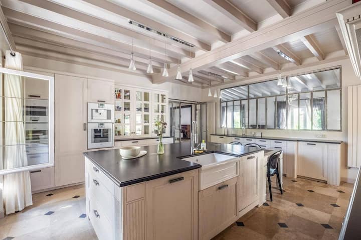 • La cocina super equipada hará las delicias de los amantes de la gastronomía: cafetera empotrada, gran encimera, dos frigoríficos, uno de ellos americano, así como todos los utensilios necesarios para preparar sus comidas y aperitivos.