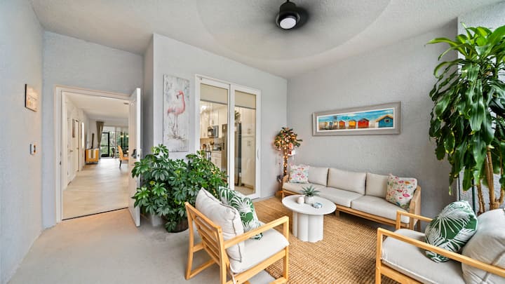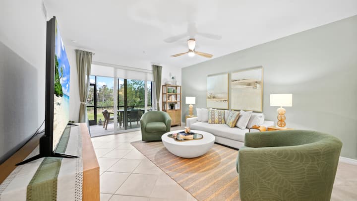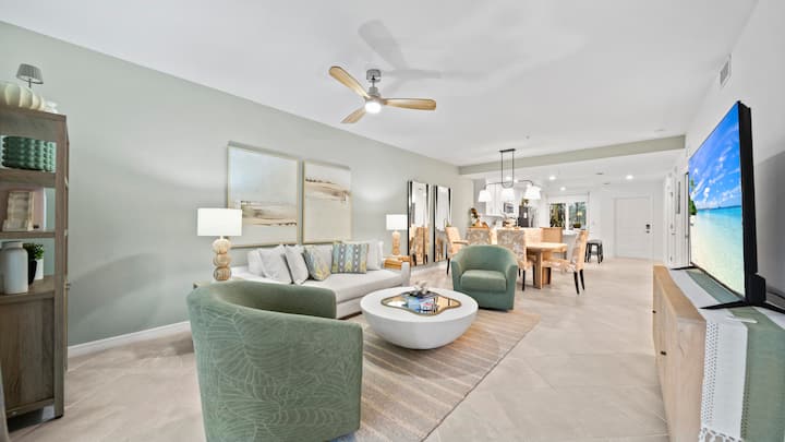 Este apartamento de 2 dormitorios, estudio con sofá cama y 2 baños, amueblado profesionalmente, es perfecto para dos parejas, ya que ofrece una comodidad elegante y vistas serenas del agua y del campo de golf. ¡Vive el lujo y la relajación de la vida en Punta Gorda!