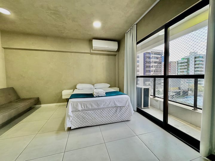 Apartamento cerca del mar con balcón, piscina y aire acondicionado.