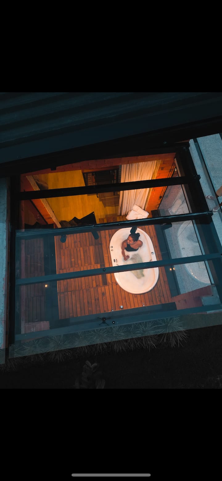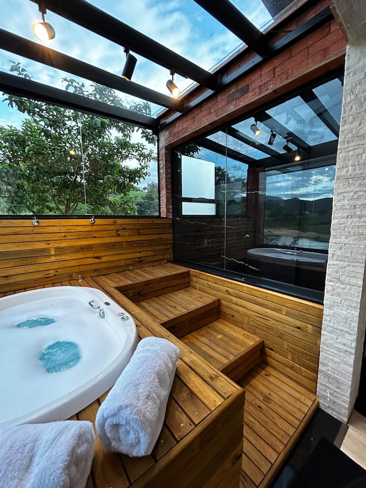 Cabaña de alto nivel, jacuzzi con vista al río.