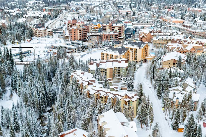 • A 3-4 minutos caminando del Quicksilver Lift/Base de Peak 9. *Ten en cuenta que el pico 9 puede estar cerrado temprano y/o tarde en la temporada. Fecha de cierre programada 12/04/2026
