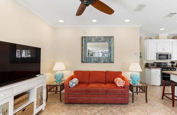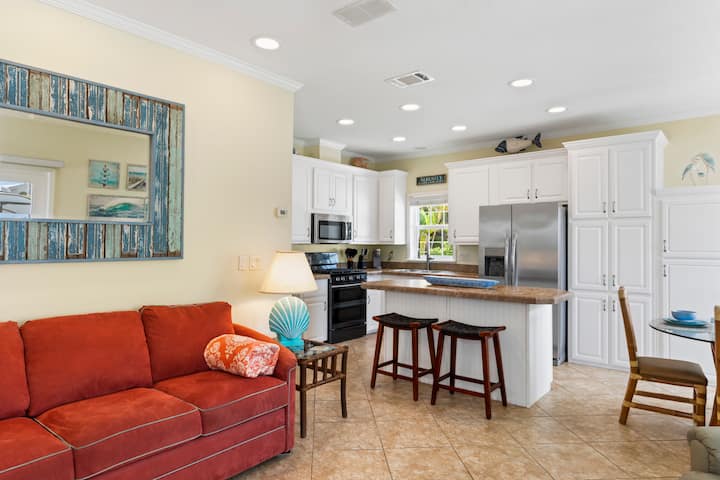 Relájate en la espaciosa suite principal con una lujosa cama tamaño queen, armarios con espejos y TV inteligente, o retírate al acogedor dormitorio de invitados con una cama tamaño queen y TV inteligente. También hay un colchón inflable tamaño queen ubicado en el armario del dormitorio de invitados para opciones adicionales para dormir. Con dos baños completos, esta casa es ideal para familias, parejas o amigos que viajan juntos. La alegre decoración costera y los suelos de baldosas contribuyen a crear un ambiente fresco y moderno.
