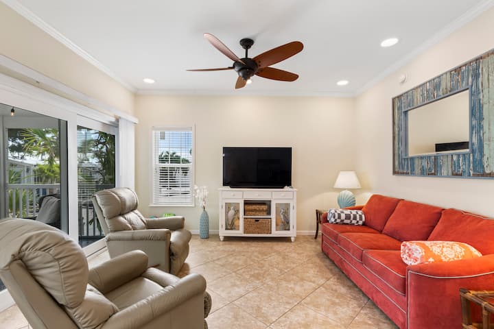Disfruta de tu escapada a los Cayos de Florida en esta casa actualizada de 2 dormitorios y 2 baños en Venture Out, a solo 20 minutos de Cayo Hueso. Las características incluyen una habitación principal tamaño king, una habitación tamaño queen, televisores inteligentes en cada habitación, cocina completa y un porche con asientos acogedores. A poca distancia de todos los servicios, con un carrito de golf disponible para alquilar ($40/día o $200/semana con exención). Los huéspedes disfrutan de la piscina, el jacuzzi, el puerto deportivo y mucho más. Se admite un perro pequeño con cargo. La entrada es para un vehículo (11.2' x 18').