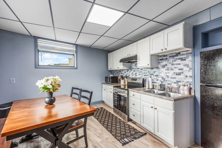 La cocina totalmente equipada es un punto destacado, con elegantes gabinetes, electrodomésticos actualizados y un elegante salpicadero de azulejos. Encontrarás todo lo que necesitas para preparar comidas en casa, incluidos fogones, horno, nevera, microondas, utensilios de cocina y cafetera. Una mesa de comedor de madera ofrece asientos para cuatro, por lo que es fácil disfrutar de comidas compartidas o planificar su próxima aventura.