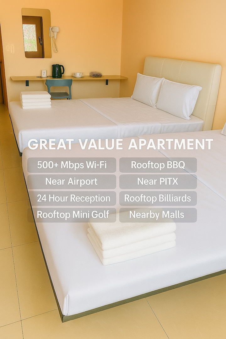 Un edificio independiente con unas 50 habitaciones, situado muy cerca de las terminales del aeropuerto de Manila. Rodeado de dormitorios de aerolíneas y aparcamiento de autobuses del aeropuerto, ofrece una gran comodidad. La propiedad cuenta con un patio privado y servicio de mayordomo 24/7, con Internet de alta velocidad de más de 500 Mbps en todas partes. Las instalaciones incluyen una mesa de billar en la azotea, una jaula de práctica de golf, una zona de barbacoa y un pequeño gimnasio. Las habitaciones están totalmente equipadas con café, secador de pelo, calentador de agua, hervidor de agua, artículos de tocador, además de cocina compartida y lavandería.