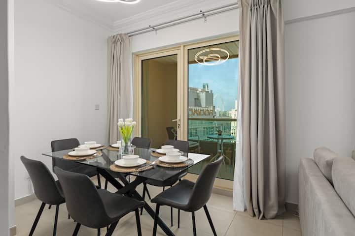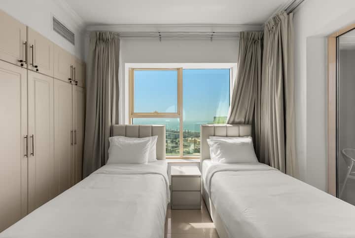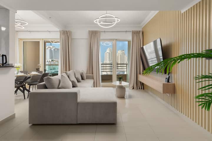 Alójate en este moderno departamento de 3 dormitorios en Dubai Marina con increíbles vistas al canal, al puerto deportivo y al horizonte de la ciudad. El espacio luminoso con tonos beige cálidos y detalles de madera se siente acogedor y atractivo. A poca distancia a pie de la playa y frente a Marina Walk, el departamento ofrece una piscina, gimnasio y todo lo esencial para una estancia cómoda y agradable en Dubai.