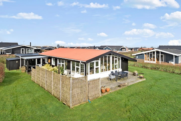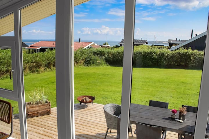 Casa de vacaciones de madera con aproximadamente 3 dormitorios (1 cama doble, 1 cama doble, 1 litera) con suelos de madera. El salón es luminoso y acogedor, amueblado con bonitos suelos de madera, muebles tapizados funcionales, reproductor de radio/CD, televisor inteligente con canales daneses y alemanes, y la opción de streaming de TV/radio/aplicaciones en el televisor, así como una bomba de calor de bajo consumo. Acogedora cocina americana con vitrocerámica, horno empotrado, campana extractora, lavavajillas, nevera-congelador y vajilla/utensilios de cocina. Desde la zona combinada de salón y cocina, se puede disfrutar de la hermosa vista sobre el paisaje y el Limfjord, y hay acceso a un fantástico comedor/veranda elevado también con magníficas vistas. Bonito baño con inodoro, ducha, lavabo y suelo de baldosas con calefacción por suelo radiante. No se permite fumar en la casa. Se permite un máximo de 1 mascota.