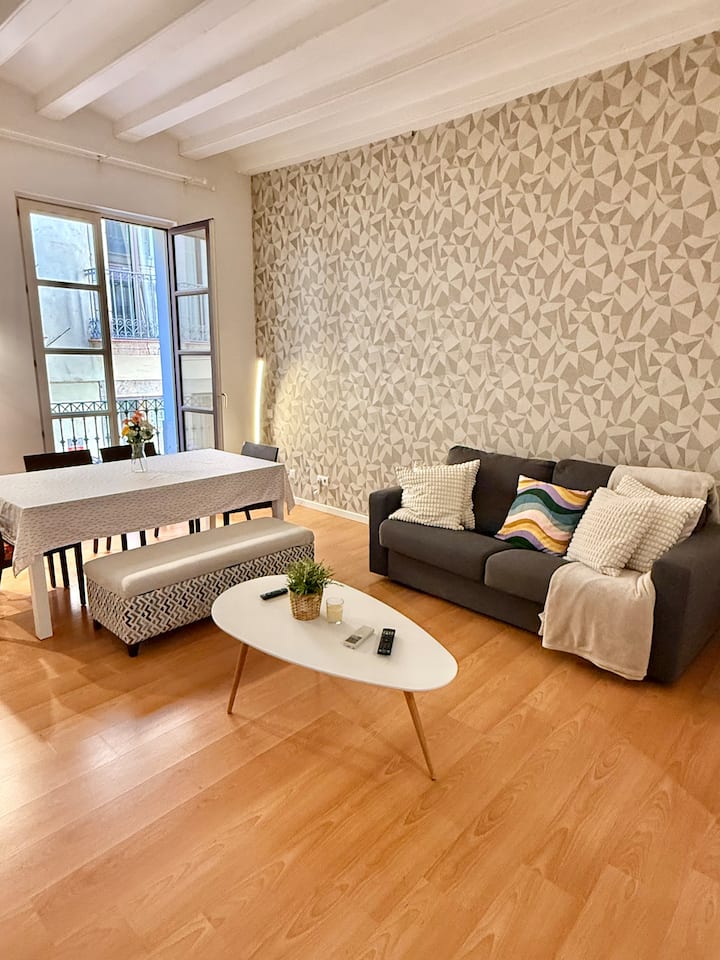 El corazón de El Born, a pocos pasos de la Basílica de Santa María del Mar. Este elegante apartamento de 70 m² combina encanto histórico y diseño moderno, con techos abovedados catalanes altos, una sala de estar con 2 sofás cama grandes x 2, un dormitorio con cama doble, un baño de diseño y una cocina totalmente equipada. Wi-Fi, un apartamento tranquilo y un balcón soleado en la calle más artística de Barcelona