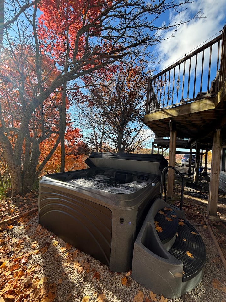 ► Disfruta de impresionantes vistas a través de ventanas de techo alto que dan al bosque, donde puedes ver el amanecer filtrándose a través de los pinos con total privacidad. Sube al patio privado para saborear el aire fresco de la mañana desde un acogedor sofá o dirígete al patio trasero para disfrutar de un baño tranquilo en el jacuzzi. Capacidad para 2 personas, cama tamaño queen