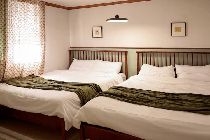 Viene con 2 camas tamaño queen para una noche de sueño confortable, un tocador, calefacción individual, aire acondicionado, wifi 5G y un baño privado. Es un gran espacio para alojarse con su familia o amigos.