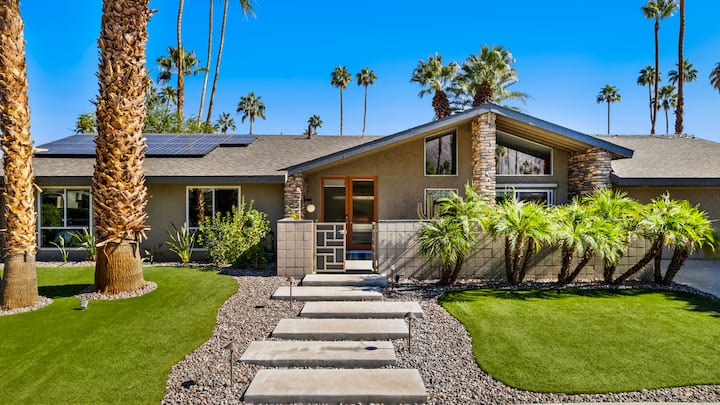 Bienvenido a The Orange Cactus, un refugio de lujo en Palm Springs, impresionantes vistas a la montaña y palmeras icónicas crean un ambiente sereno. Nuestro patio trasero de estilo resort cuenta con una piscina resplandeciente, spa y tumbonas de lujo bajo sombrillas retro, perfectas para relajarse. En el interior, una iluminación cálida y un elegante diseño abierto. El exuberante paisajismo garantiza la privacidad, lo que hace de este oasis de lujo en el desierto una opción ideal para relajarse y explorar. Tu escapada inolvidable te espera en The Orange Cactus.