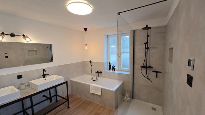 Kellmünz es una comunidad pequeña y encantadora donde puedes llegar a todo para las necesidades diarias en poco tiempo. La casa está justo en el Iller, perfecta para los amantes de la naturaleza. Se puede llegar al carril bici de Iller en bicicleta en unos 3 minutos, así como a numerosos y hermosos senderos para caminar y andar en bicicleta.